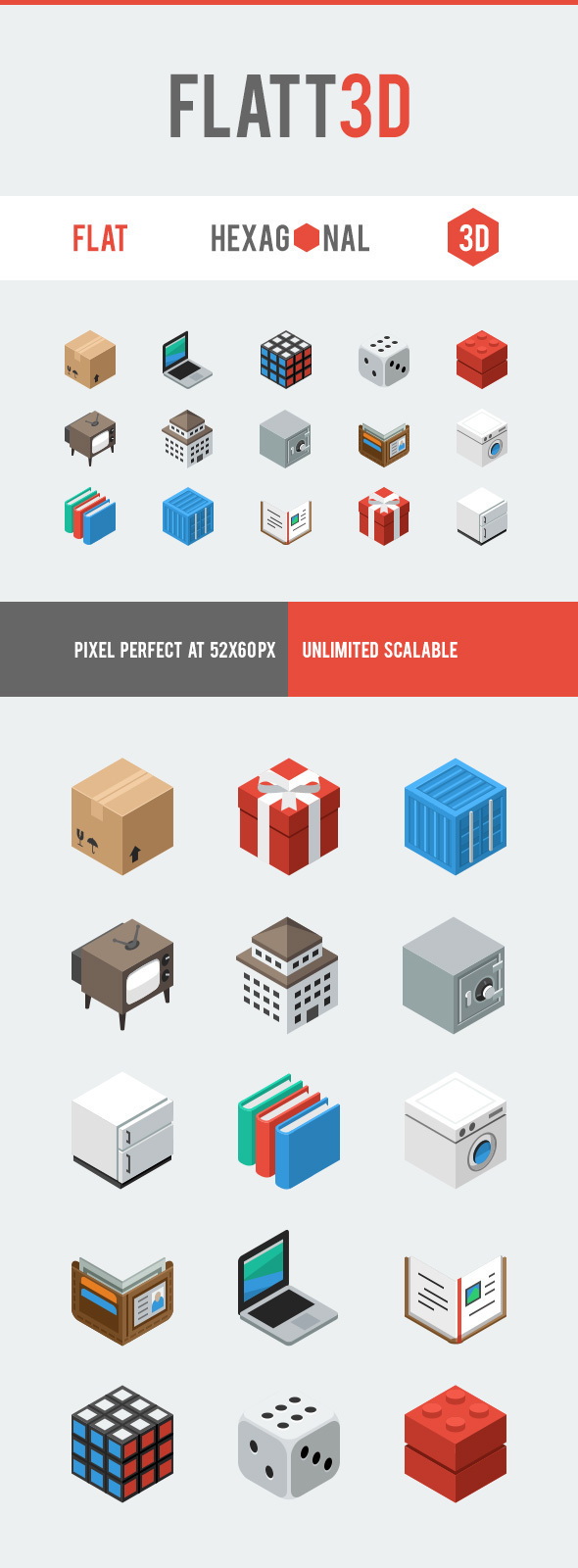 Flatt3d is simple, flat, hexagonal, and 3D icons. Suitable for website, digital and print media. Pixel perfect in 64×64 and unlimited scalable in vector format.